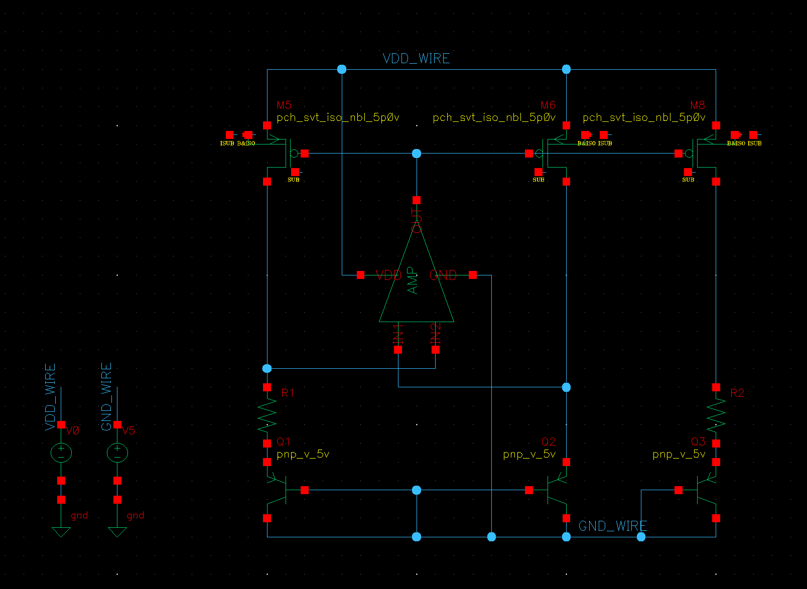 选择pmos宽长比统一为480n/1.3u,注意放大器正负极不能接反,否则无法钳位。