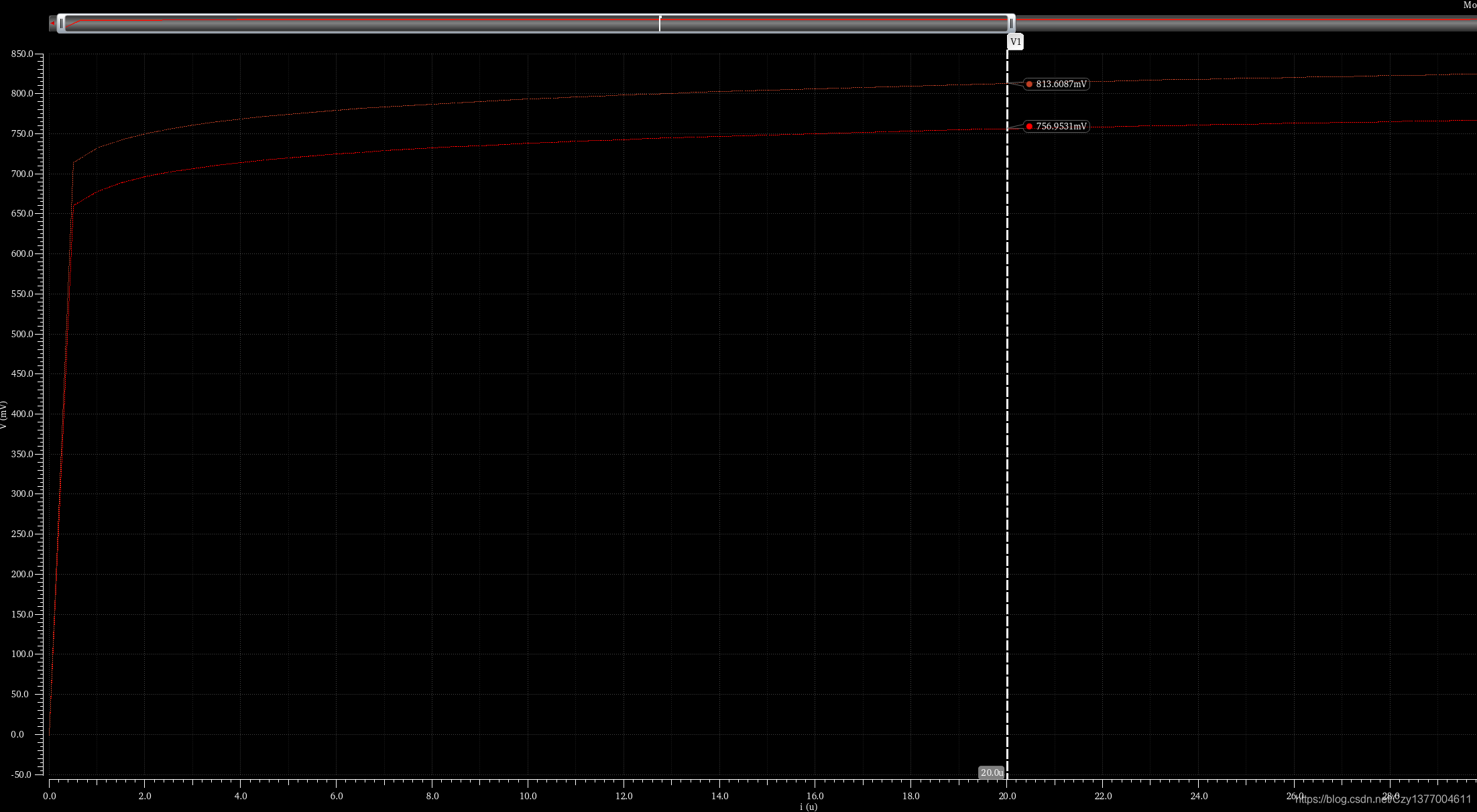 结果如图所示,选择工作电压20uA,可得▲VBE=813.609-756.953mV。