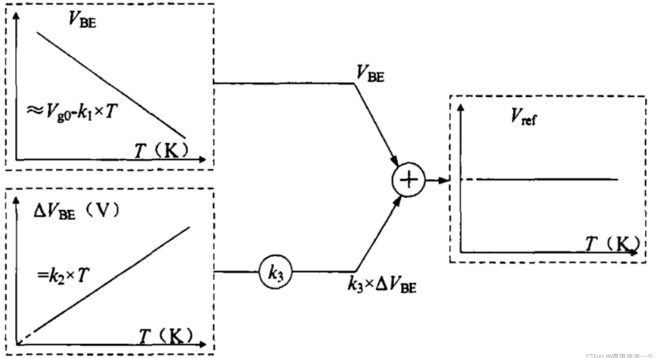 双极晶体管的温度系数较好,呈现负温度系数。同时,若给两个双极性晶体管施加不同的电流,它们的电压差值就与绝对温度成正比,呈现正温度系数。利用这两者,就可以产生零温度系数的输出。