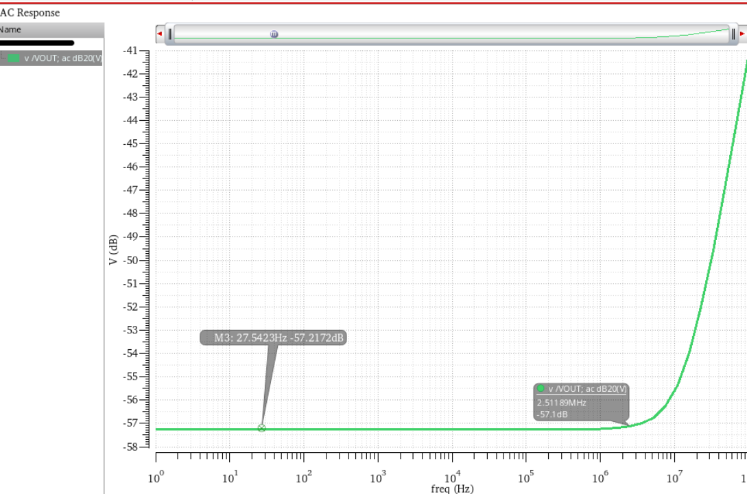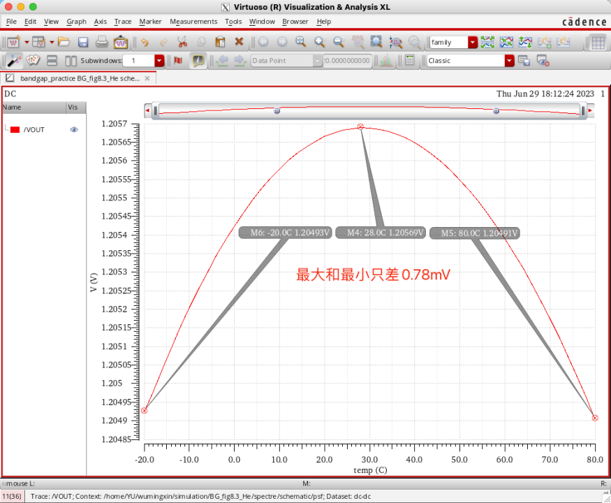 可以看到PSRR为:57dB,不高,带隙的PSRR在100dB以上才算高PSRR,但看应用背景,并不一定所有带隙都需要高PSRR。