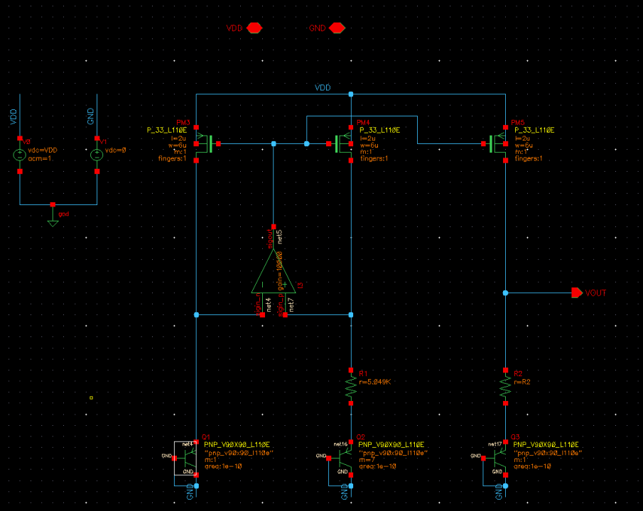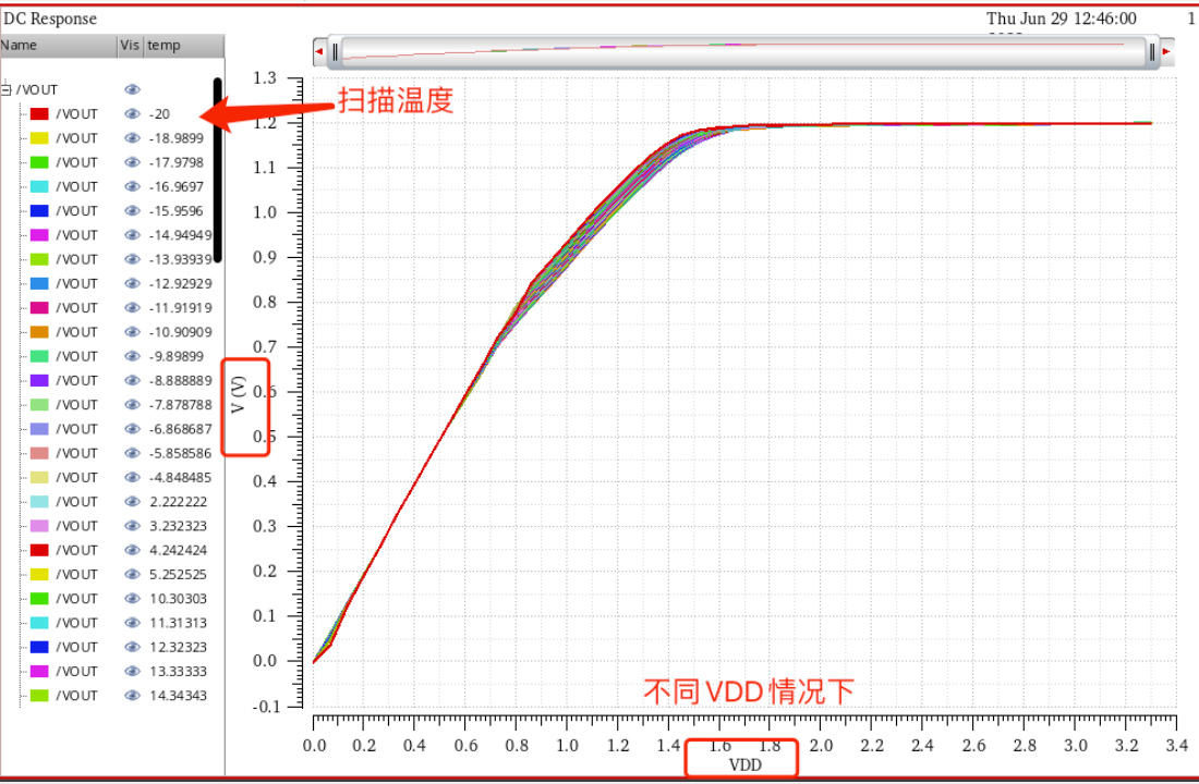 电阻R2主要确定电路的温度系数,(正温度系数的权重)这个时候输出电压是不随着电源电压变化而变化的了,就不再用扫描VDD了,why?
