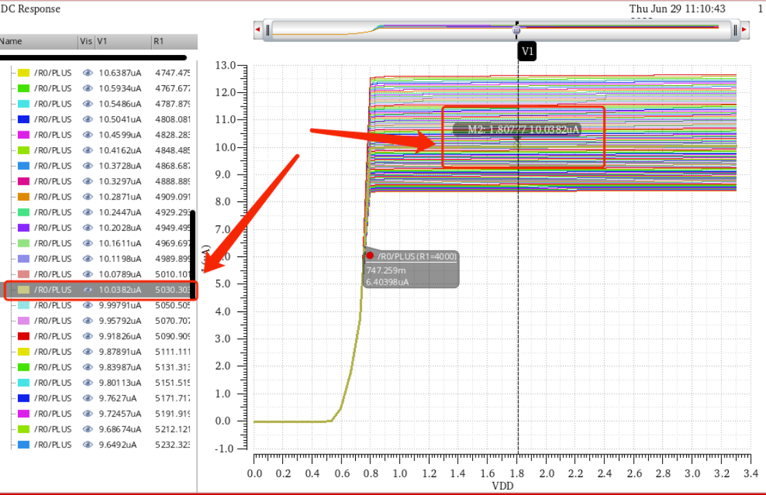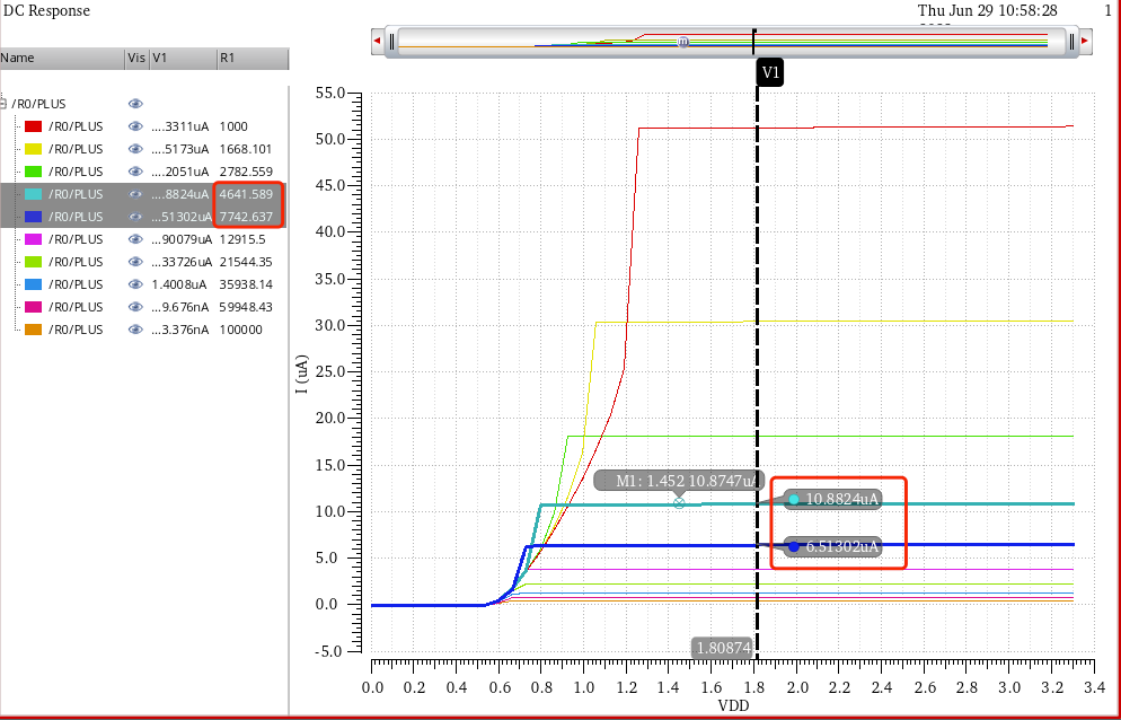 R1决定了其支路的电流,因为前面定了支路电流为10μA,电压➗电阻=电流,我们通过扫描电阻R1阻值,看支路电流为10μA的情况下,阻值是多大,扫描的时候,看的是R1这一支路电流,所以可以将R2先设置为1K。我们跑DC,让VDD从0~3.3V变化,在Tools里选扫描参数,将R1从1K扫描到100K: