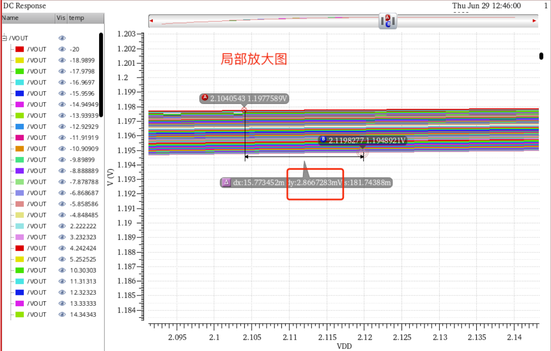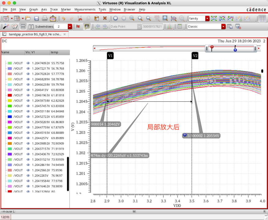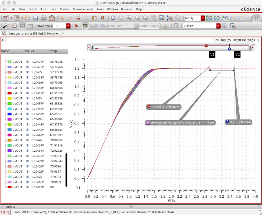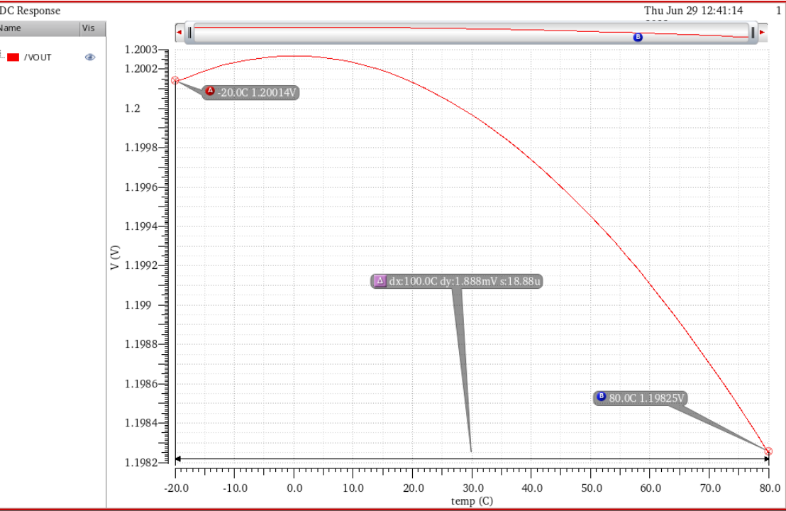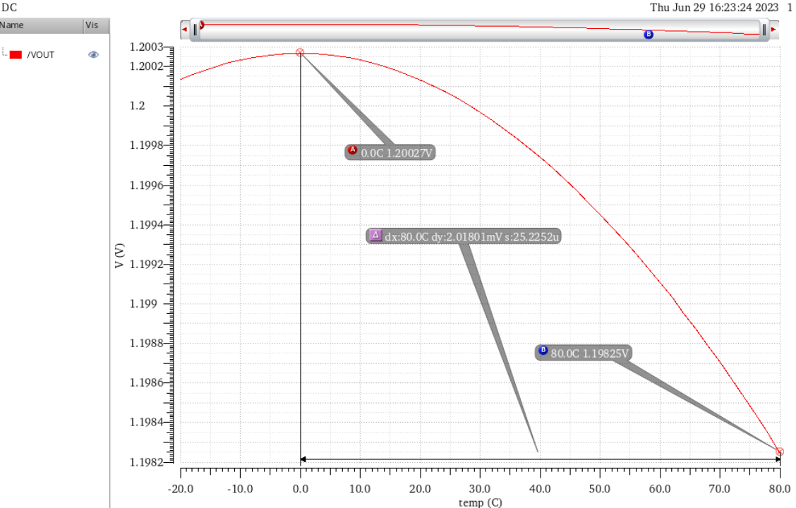 同样可以看到,在不同温度下,随着VDD的变化(当然VDD要使管子正常工作),在大概1.6V之后,其输出电压稳定,在-20~80℃的波动下,其输出电压只差了2.86mV。