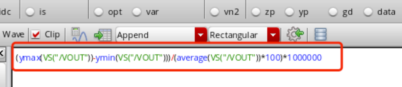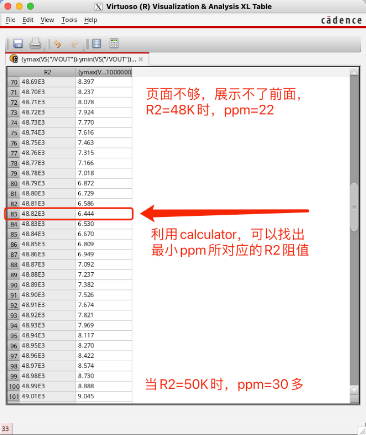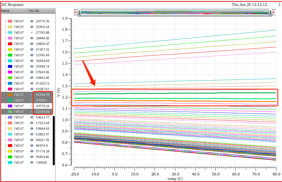 将扫描设置成DC扫描,DC里扫描温度,参数扫描里扫描R2的阻值,观察Vout的变化情况,看温度系数的权重是否正确,只有当vout不变的时候,权重才正确。从而可以得到不随温度变化的输出电压Vout