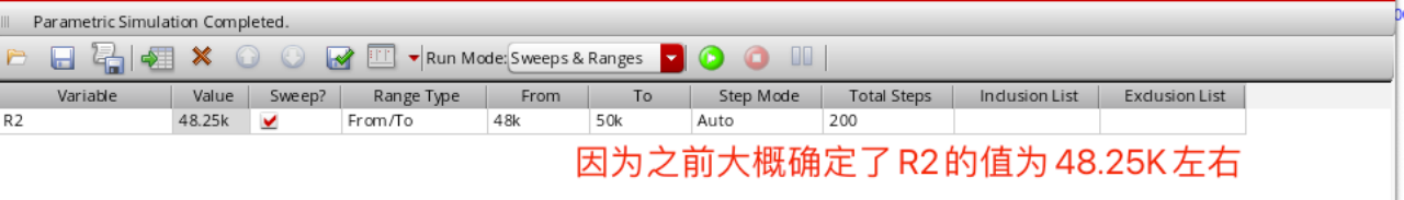 得到输出电流和电阻R1阻值的关系,这里我们确定R1的范围在4.6K附近,重新缩小范围继续扫描,从4K扫描到6K,扫描100个点