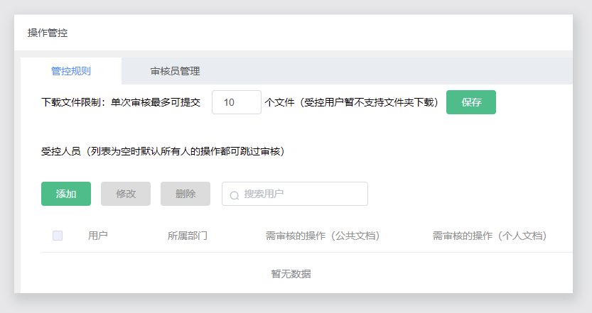 这时候就可以添加审批策略。针对部分人员,当其下载文件或创建外链时,需由审核员审批通过才能成功。