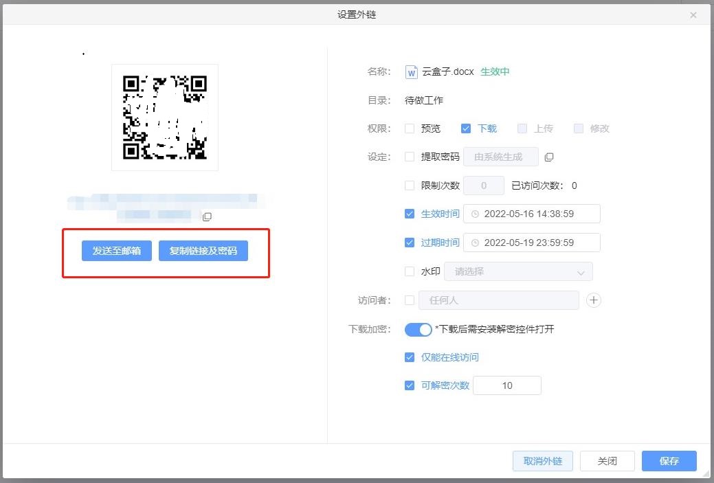 下载加密应用于文件链接外发,比如一份内部技术方案,你需要分享给合作公司,你希望对方能正常地在本地浏览,但是怎么都带不走,比如转发无效,打印无效,截屏无效、复制粘贴无效。在对文件创建外链时,打开【下载加密】开关即可。