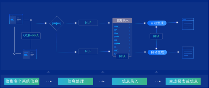图7是达观网站上的RPA处理流程,结合NLP技术,模拟人工在不同系统中查询操作,自动进行信息收集和提取,生成用户所需报表,自动化录入后续业务系统。