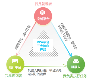 RPA平台一般由设计平台、机器人、控制平台组成。设计平台主要完成可视化的流程编辑工作,设计平台的演变趋势是引入低代码技术,让流程设计门槛更低。机器人则是在设计平台流程完成设计后自动执行操作,通常无人值守,少数情况下需要人工干预。控制平台主要协调管理机器人运行,合理分工,控制风险。