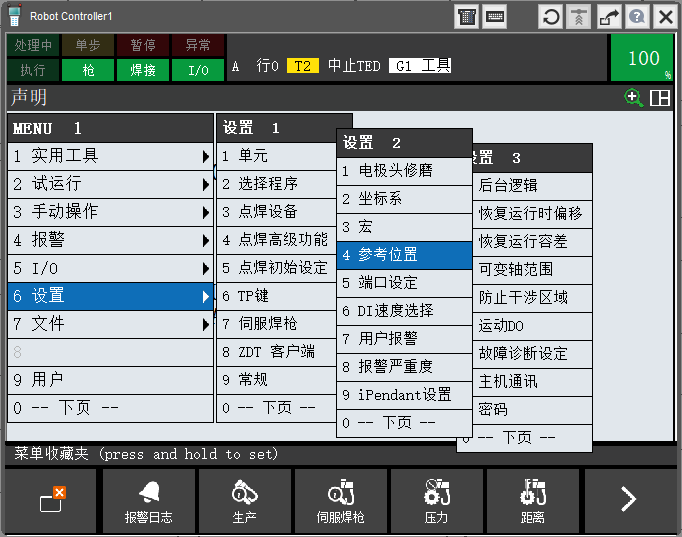1.机器人示教器上按“MENU (菜单)”键,在弹出的“MENU 1” 菜单画面中,依次选择“6 设置”→“设置 2”→“4 参考位置”。