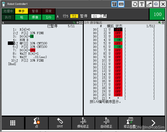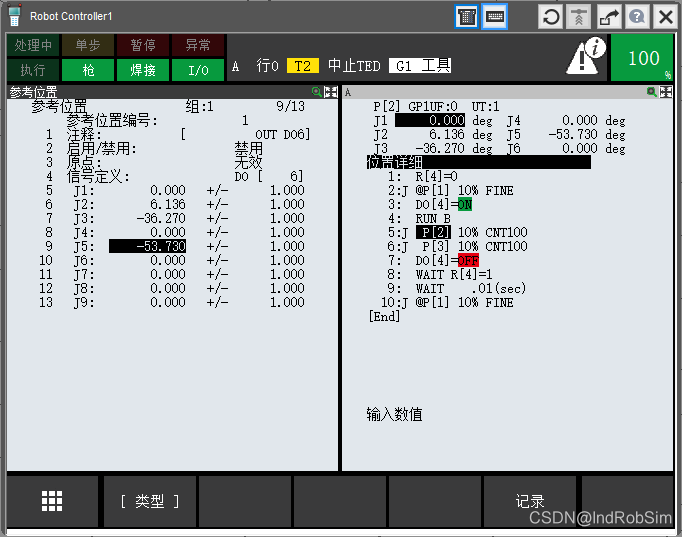 这里也可以手动运行机器人到参考位置处,同样可以监视到数字量输出信号DO[6]的状态变化。