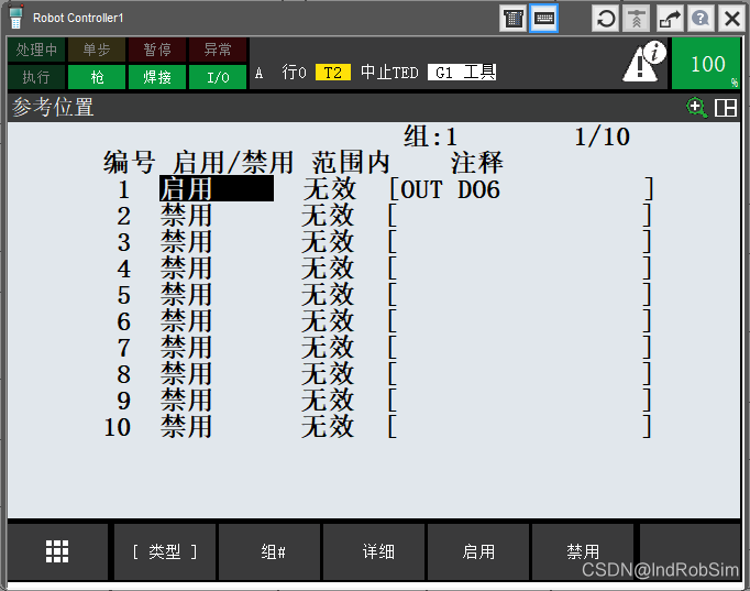 4.完成设定后按下“PREV(返回)”键,返回参考位置一览画面。然后,选择编号为1的参考位置,点击“启用”。此时,设定的机器人参考位置功能已经生效。