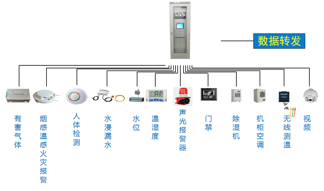 系统可接入各类传感器和可控设备,通过通信层采集数据并根据要求转发给其他系统。Acrel 2000E/G是标准电力柜大小,应用场景广泛,系统功能强大,可监测环境参量(温湿度、SF6气体、烟感、红外、水浸等),联动控制部分设备(风机、水泵、空调等),也可接入门禁安防系统、视频监控系统以及我司无线测温装置,其中测温点接入不超过240个,仪表可接入不超过20台。