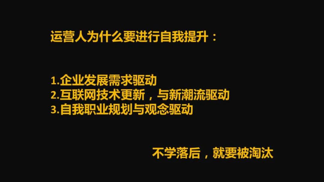 落后就不能适应社会,落后就没有饭吃,不信可以去找找看10年前互联网运营岗位要求看看绝对与现在天差地别,宣传推广平台渠道从单纯的网页展示到多样复杂的复合式营销形式,这是运营人需要自我提升的原因之一。