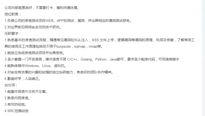 大家看了上面三家的招聘要求是否发现,目前作为初级网络安全工程师的要求都是差不多的,主要框架就是熟练使用工具、熟悉渗透测试流程为主。