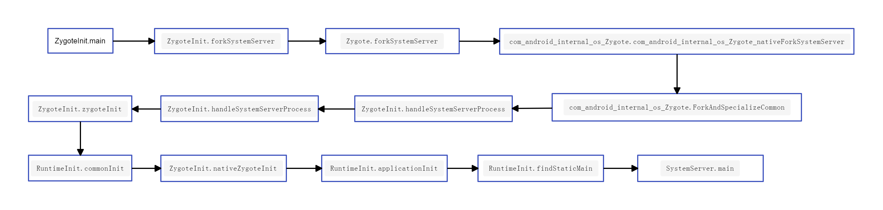 /*** Finish remaining work for the newly forked system server process.*/private static Runnable handleSystemServerProcess(ZygoteConnection.Arguments parsedArgs) {// set umask to 0077 so new files and directories will default to owner-only permissions.Os.umask(S_IRWXG | S_IRWXO);if (parsedArgs.niceName != null) {//设置当前进程名为"system_server"Process.setArgV0(parsedArgs.niceName);}final String systemServerClasspath = Os.getenv("SYSTEMSERVERCLASSPATH");if (systemServerClasspath != null) {//执行dex优化操作performSystemServerDexOpt(systemServerClasspath);// Capturing profiles is only supported for debug or eng builds since selinux normally// prevents it.boolean profileSystemServer = SystemProperties.getBoolean("dalvik.vm.profilesystemserver", false);if (profileSystemServer && (Build.IS_USERDEBUG || Build.IS_ENG)) {try {//准备system server配置prepareSystemServerProfile(systemServerClasspath);} catch (Exception e) {Log.wtf(TAG, "Failed to set up system server profile", e);}}}if (parsedArgs.invokeWith != null) {String[] args = parsedArgs.remainingArgs;// If we have a non-null system server class path, we'll have to duplicate the// existing arguments and append the classpath to it. ART will handle the classpath//ART将处理现有的参数附加上classpath。// correctly when we exec a new process.if (systemServerClasspath != null) {String[] amendedArgs = new String[args.length + 2];amendedArgs[0] = "-cp";amendedArgs[1] = systemServerClasspath;System.arraycopy(args, 0, amendedArgs, 2, args.length);args = amendedArgs;}//启动应用进程WrapperInit.execApplication(parsedArgs.invokeWith,parsedArgs.niceName, parsedArgs.targetSdkVersion,VMRuntime.getCurrentInstructionSet(), null, args);throw new IllegalStateException("Unexpected return from WrapperInit.execApplication");} else {ClassLoader cl = null;if (systemServerClasspath != null) {// 创建类加载器,并赋予当前线程cl = createPathClassLoader(systemServerClasspath, parsedArgs.targetSdkVersion);Thread.currentThread().setContextClassLoader(cl);}/** Pass the remaining arguments to SystemServer.*///system_server故进入此分支return ZygoteInit.zygoteInit(parsedArgs.targetSdkVersion, parsedArgs.remainingArgs, cl);}}