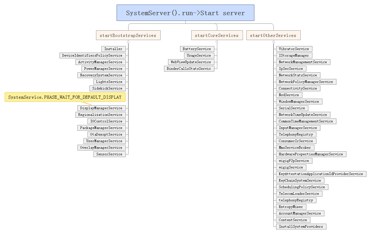/*** Starts a miscellaneous grab bag of stuff that has yet to be refactored* and organized.*/private void startOtherServices() {......// For debugging RescueParty//用于救援机制调试if (Build.IS_DEBUGGABLE && SystemProperties.getBoolean("debug.crash_system", false)) {throw new RuntimeException();}try {final String SECONDARY_ZYGOTE_PRELOAD = "SecondaryZygotePreload";//第二次Zygote proloadmZygotePreload = SystemServerInitThreadPool.get().submit(() -> {try {if (!Process.zygoteProcess.preloadDefault(Build.SUPPORTED_32_BIT_ABIS[0])) {Slog.e(TAG, "Unable to preload default resources");}} catch (Exception ex) {}}, SECONDARY_ZYGOTE_PRELOAD);//该服务根据UID提供应用描述信息。ServiceManager.addService("sec_key_att_app_id_provider",new KeyAttestationApplicationIdProviderService(context));//该服务是替换KeyChain提供存储凭证的私钥。mSystemServiceManager.startService(KeyChainSystemService.class);//启动执行策略服务ServiceManager.addService("scheduling_policy", new SchedulingPolicyService());......//resolvermContentResolver = context.getContentResolver();//providermActivityManagerService.installSystemProviders();// Now that SettingsProvider is ready, reactivate SQLiteCompatibilityWalFlagsSQLiteCompatibilityWalFlags.reset();traceEnd();// Records errors and logs, for example wtf()// Currently this service indirectly depends on SettingsProvider so do this after// InstallSystemProviders.traceBeginAndSlog("StartDropBoxManager");mSystemServiceManager.startService(DropBoxManagerService.class);traceEnd();traceBeginAndSlog("StartVibratorService");vibrator = new VibratorService(context);ServiceManager.addService("vibrator", vibrator);traceEnd();if (!isWatch) {traceBeginAndSlog("StartConsumerIrService");consumerIr = new ConsumerIrService(context);ServiceManager.addService(Context.CONSUMER_IR_SERVICE, consumerIr);traceEnd();}traceBeginAndSlog("StartAlarmManagerService");mSystemServiceManager.startService(AlarmManagerService.class);traceEnd();traceBeginAndSlog("InitWatchdog");final Watchdog watchdog = Watchdog.getInstance();watchdog.init(context, mActivityManagerService);traceEnd();traceBeginAndSlog("StartInputManagerService");inputManager = new InputManagerService(context);traceEnd();traceBeginAndSlog("StartWindowManagerService");// WMS needs sensor service readyConcurrentUtils.waitForFutureNoInterrupt(mSensorServiceStart, START_SENSOR_SERVICE);mSensorServiceStart = null;wm = WindowManagerService.main(context, inputManager,mFactoryTestMode != FactoryTest.FACTORY_TEST_LOW_LEVEL,!mFirstBoot, mOnlyCore, new PhoneWindowManager());ServiceManager.addService(Context.WINDOW_SERVICE, wm, /* allowIsolated= */ false,DUMP_FLAG_PRIORITY_CRITICAL | DUMP_FLAG_PROTO);ServiceManager.addService(Context.INPUT_SERVICE, inputManager,/* allowIsolated= */ false, DUMP_FLAG_PRIORITY_CRITICAL);traceEnd();traceBeginAndSlog("SetWindowManagerService");mActivityManagerService.setWindowManager(wm);traceEnd();traceBeginAndSlog("WindowManagerServiceOnInitReady");wm.onInitReady();traceEnd();// Start receiving calls from HIDL services. Start in in a separate thread// because it need to connect to SensorManager. This have to start// after START_SENSOR_SERVICE is done.SystemServerInitThreadPool.get().submit(() -> {TimingsTraceLog traceLog = new TimingsTraceLog(SYSTEM_SERVER_TIMING_ASYNC_TAG, Trace.TRACE_TAG_SYSTEM_SERVER);traceLog.traceBegin(START_HIDL_SERVICES);startHidlServices();traceLog.traceEnd();}, START_HIDL_SERVICES);if (!isWatch && enableVrService) {traceBeginAndSlog("StartVrManagerService");mSystemServiceManager.startService(VrManagerService.class);traceEnd();}traceBeginAndSlog("StartInputManager");inputManager.setWindowManagerCallbacks(wm.getInputMonitor());inputManager.start();traceEnd();// TODO: Use service dependencies instead.traceBeginAndSlog("DisplayManagerWindowManagerAndInputReady");mDisplayManagerService.windowManagerAndInputReady();traceEnd();// Skip Bluetooth if we have an emulator kernel// TODO: Use a more reliable check to see if this product should// support Bluetooth - see bug 988521if (isEmulator) {Slog.i(TAG, "No Bluetooth Service (emulator)");} else if (mFactoryTestMode == FactoryTest.FACTORY_TEST_LOW_LEVEL) {Slog.i(TAG, "No Bluetooth Service (factory test)");} else if (!context.getPackageManager().hasSystemFeature(PackageManager.FEATURE_BLUETOOTH)) {Slog.i(TAG, "No Bluetooth Service (Bluetooth Hardware Not Present)");} else {traceBeginAndSlog("StartBluetoothService");mSystemServiceManager.startService(BluetoothService.class);traceEnd();}traceBeginAndSlog("IpConnectivityMetrics");mSystemServiceManager.startService(IpConnectivityMetrics.class);traceEnd();traceBeginAndSlog("NetworkWatchlistService");mSystemServiceManager.startService(NetworkWatchlistService.Lifecycle.class);traceEnd();traceBeginAndSlog("PinnerService");mSystemServiceManager.startService(PinnerService.class);traceEnd();} catch (RuntimeException e) {Slog.e("System", "******************************************");Slog.e("System", "************ Failure starting core service", e);}StatusBarManagerService statusBar = null;INotificationManager notification = null;LocationManagerService location = null;CountryDetectorService countryDetector = null;ILockSettings lockSettings = null;MediaRouterService mediaRouter = null;// Bring up services needed for UI.if (mFactoryTestMode != FactoryTest.FACTORY_TEST_LOW_LEVEL) {traceBeginAndSlog("StartInputMethodManagerLifecycle");mSystemServiceManager.startService(InputMethodManagerService.Lifecycle.class);traceEnd();traceBeginAndSlog("StartAccessibilityManagerService");try {ServiceManager.addService(Context.ACCESSIBILITY_SERVICE,new AccessibilityManagerService(context));} catch (Throwable e) {reportWtf("starting Accessibility Manager", e);}traceEnd();}traceBeginAndSlog("MakeDisplayReady");try {wm.displayReady();} catch (Throwable e) {reportWtf("making display ready", e);}traceEnd();if (mFactoryTestMode != FactoryTest.FACTORY_TEST_LOW_LEVEL) {if (!"0".equals(SystemProperties.get("system_