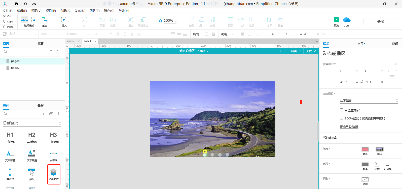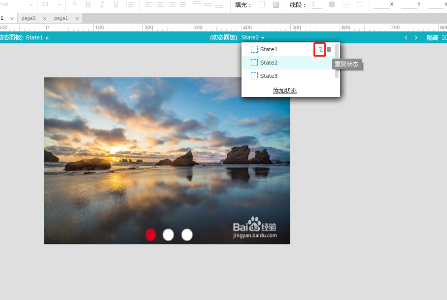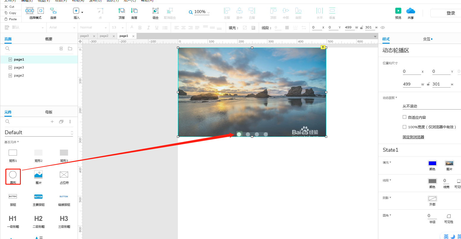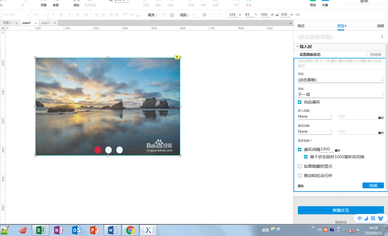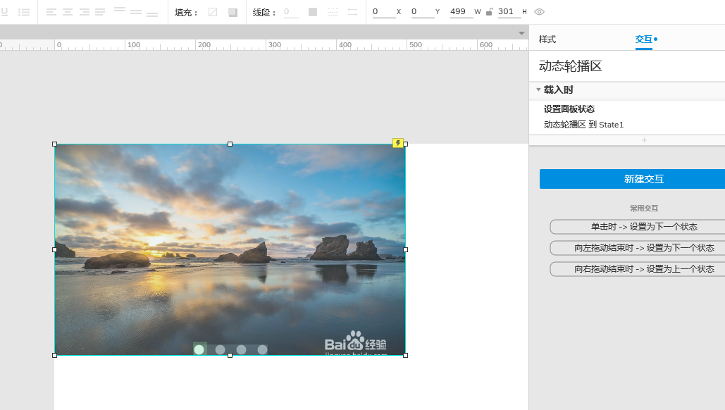 然后关闭动态面板编辑页面。选中图片,然后点击右侧“新建交互”按钮会打开事件列表,这里事件我们选择“载入时”,动作选择“设置面板状态”,目标选择图片对应的动态面板,state选择下一项并勾选上“向后循环”复选框和“循环间隔”,间隔时间我这里设置的是1S,最后进行保存预览就ok啦(state中的各个选项都是可以根据自己需要来进行设置的哦)。