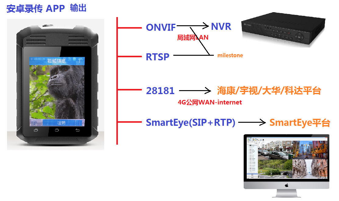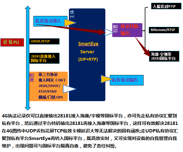 4G执法记录仪可以直接输出28181接入海康/宇视等国标平台,亦可先走私有协议汇聚到私有平台,然后通过平台转码输出28181再接入海康等国标平台,这样可有效解决28181在4G图传中UDP丢包花屏TCP低效卡顿延迟大等无法解决的固有顽疾;走UDP私有协议汇聚到私有平台SmartEye再转入国标平台,既高效实时,又可实现对设备的自我管理自我维护,出现问题可与国标平台隔离自查,避免了责任纠纷。