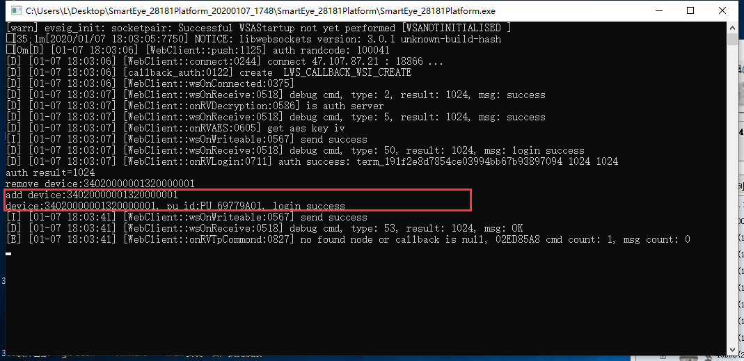 双击打开SmartEye_28181Platform.exe应用文件,出现下图CMD窗口中红色方框标注的信息,表示设备登录成功。