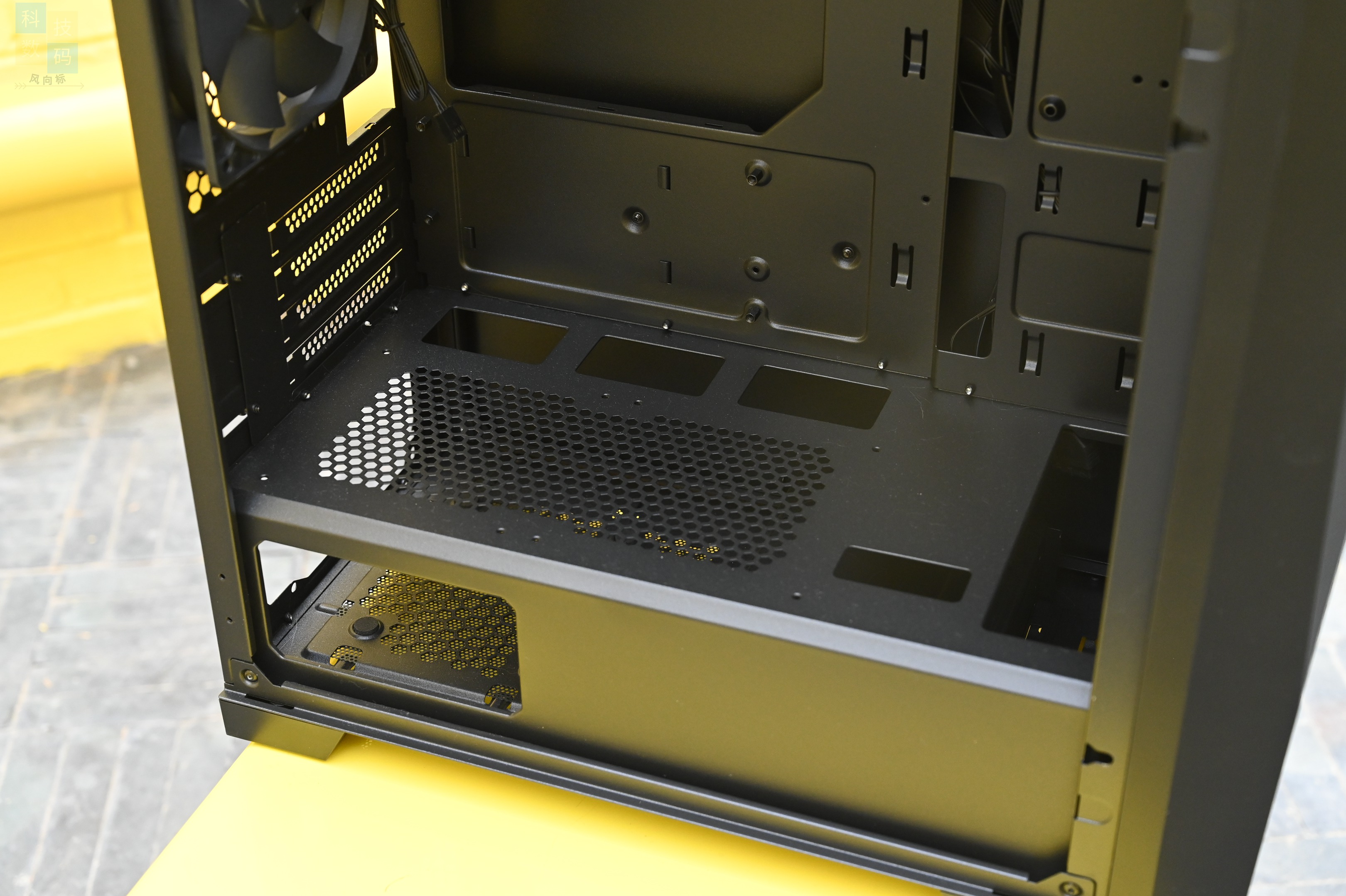 另外可以看到,在电源仓顶部还有大面积的散热孔,并且配备了两个风扇位,这里就是安钛克Flux机箱里面常见的显卡风道,对于有显卡的玩家,可以进一步提升显卡的散热体验,如果配上RGB风扇的话,更可以进一步突出空气显卡的尊贵地位。