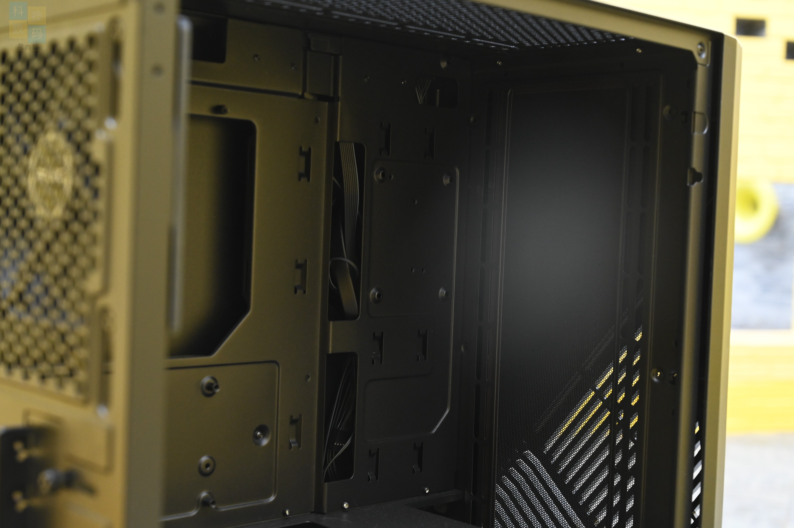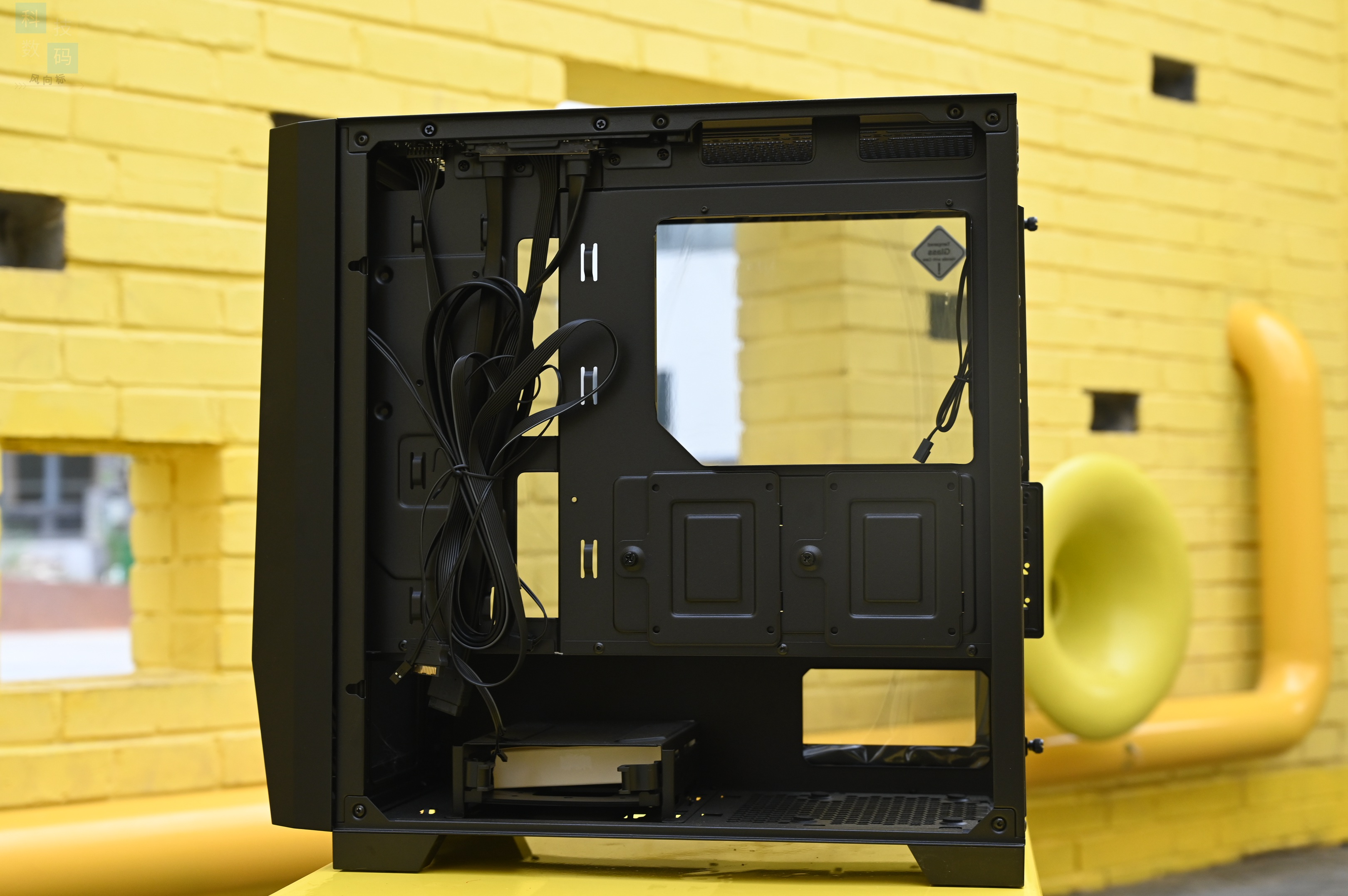 在机箱背板的另一侧,我们可以找到比较宽裕的走线空间,并且这里的硬盘位也比较多,底部的硬盘仓可以安装两个2.5或者3.5英寸硬盘,背板上面还有3个2.5英寸硬盘位,这对于主机的存储扩展很有帮助,毕竟现在SATA协议的固态硬盘相对更有性价比一些。
