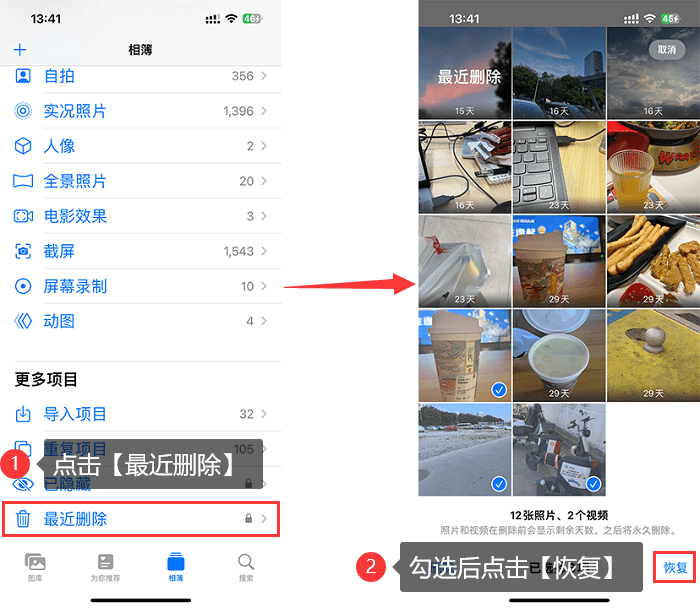 一般来说,手机照片和视频删除后都会被暂时保留在相册回收站,iPhone手机也不例外。如何恢复手机删除的照片和视频?苹果用户可以在【最近删除】回收站中恢复30天内删除的照片和视频,该方法的具体操作如下: