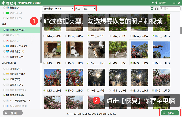 第2步:预览照片和视频后,点击【选择】对想要恢复的照片和视频进行勾选,然后点击【恢复】即可将照片和视频复原到原文件夹。