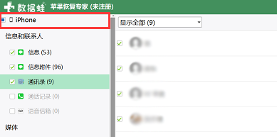 3、扫描完毕后软件默认数据全选,大家可以先点击左上方的【手机】图标取消全选。