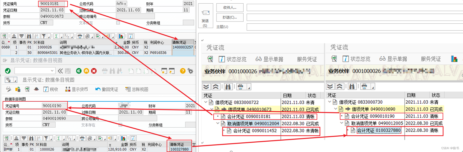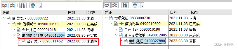 当时也没太明白怎么回事?后来通过两笔销售的凭证流观察了一下(如下图)。发现两笔冲销会计凭证的状态确实不同。五笔显示未清账,一笔显示清账。
