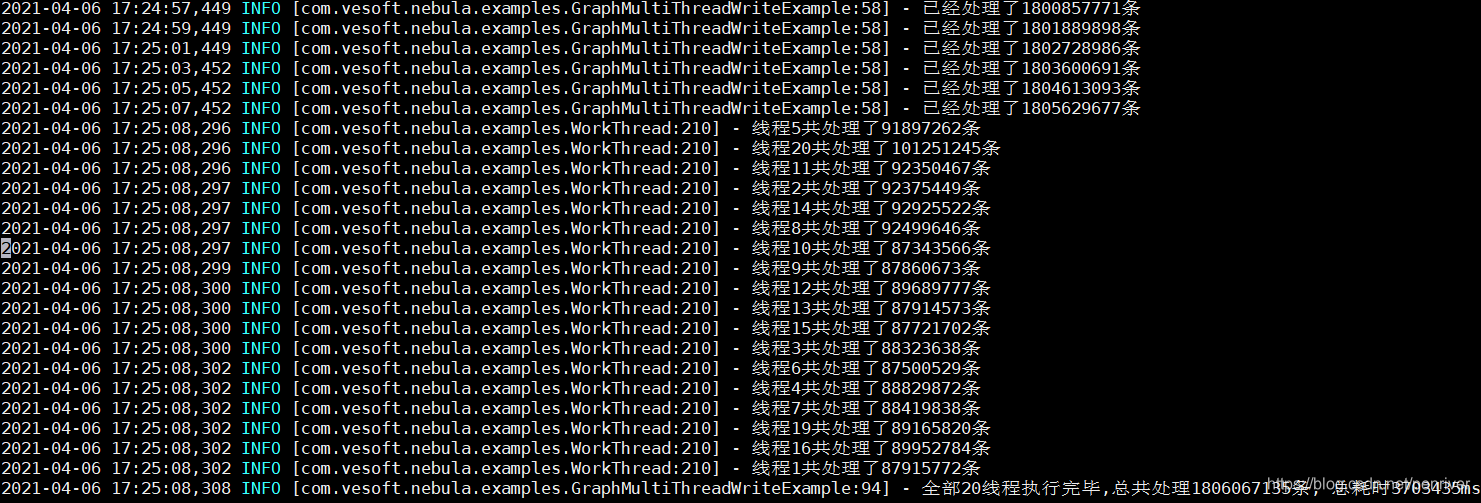 import java.util.concurrent.atomic.AtomicLong;public class GraphMultiThreadWriteExample {private static final Logger logger = LoggerFactory.getLogger(GraphMultiThreadWriteExample.class);private static final NebulaPool pool = new NebulaPool();private static volatile boolean isRunning = false;public static void main(String[] args) throws IOException, InterruptedException {String dataFile = "vertexs.txt";int dataType = 1;int numThread = 3;int batchNum = 100;if (args.length > 3) {dataFile = args[0].trim();dataType = NumberUtils.toInt(args[1]);numThread = NumberUtils.toInt(args[2]);batchNum = NumberUtils.toInt(args[3]);}BlockingQueue queue = new ArrayBlockingQueue(10000);ExecutorService executor = Executors.newFixedThreadPool(numThread+1);Runtime.getRuntime().addShutdownHook(getExitHandler());initPool();CountDownLatch latch = new CountDownLatch(numThread);List workThreads = Lists.newArrayList();try {for (int k = 0; k < numThread; k++) {WorkThread workThread = new WorkThread(queue, pool, batchNum, dataType, latch);workThreads.add(workThread);executor.execute(workThread);}} catch (Exception e) {logger.error("添加工作线程失败", e);}isRunning = true;Runnable statThread = () -> {while (isRunning) {long total = workThreads.stream().map(x -> x.getProcessNum()).reduce(0L, (a, b) -> a + b);logger.info("已经处理了{}条", total);try {TimeUnit.MILLISECONDS.sleep(2000);} catch (InterruptedException e) {