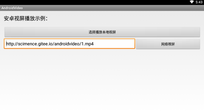 {EditText edit;@Overrideprotected void onCreate(Bundle savedInstanceState){super.onCreate(savedInstanceState);this.setContentView(R.layout.activity_main);edit = (EditText) this.findViewById(R.id.textWebUrl);}/** 选择播放本地视屏资源 */public void btnLocal_Click(View view){Toast.makeText(this, "请选取一个待播放的视屏文件", Toast.LENGTH_SHORT).show();selectFile(this, "video/*", true); // 选取视屏并播放// ShowVideo.Open(this, "/sdcard/sc/video/tank_zmpy.mp4"); // 播放指定路径下的视屏}/** 播放网址对应的视屏资源 */public void btnWeb_Click(View view){String videoPath = edit.getText().toString();ShowVideo.Open(this, videoPath);}/** 调用系统方法选择文件 */private void selectFile(Activity context, String type, boolean autoPlay){Intent intent = new Intent(Intent.ACTION_GET_CONTENT);intent.setType(type); // 设置类型,我这里是任意类型,任意后缀的可以这样写。intent.addCategory(Intent.CATEGORY_OPENABLE);if (autoPlay)context.startActivityForResult(intent, SELECT);else context.startActivityForResult(intent, SELECT_ONLY);}final static int SELECT_ONLY = 3; // 标记选取final static int SELECT = 1; // 标记选取final static int SHARE = 2; // 标记分享/** Activity执行结果 */protected void onActivityResult(int requestCode, int resultCode, Intent data){if (resultCode == Activity.RESULT_OK){if (requestCode == SELECT){Uri uri = data.getData();