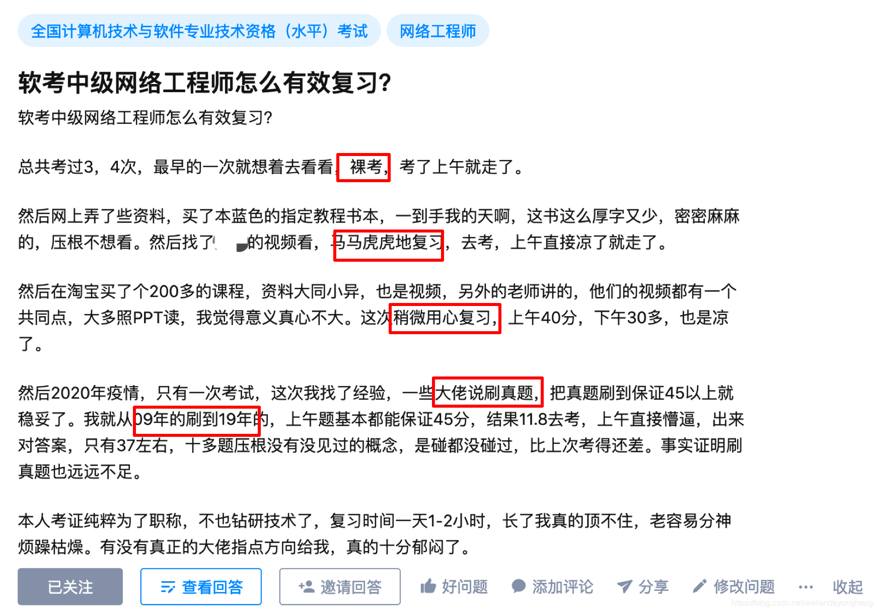 坑1:裸考。可能大家在各大群、或者论坛,经常看到有人吹牛裸考过中级,我想说,看看就好,某乎上还人人年薪百万呢。以夏老师自己为例,我2011年考过了CCIE,而且是自学考过的,但后来我考软考网络工程师,也是报班学习的,虽然可以自学,但结婚生小孩后,时间真的有限!基础很好的CCIE尚且要听老师讲课,一般人裸考通过的概率有多高?大家自己掂量一下吧…