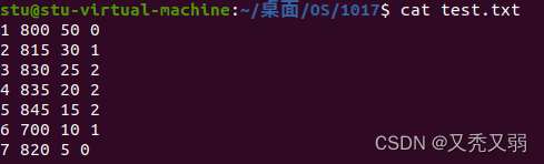 {FILE* fp;char fname[20];int i;//输入测试文件名printf("please input job data file name\n");scanf("%s", fname);if ((fp = fopen(fname, "r")) == NULL){printf("Error! Open file failed, please chech filename:\n");}else{//依次读取作业信息while (!feof(fp)){if (fscanf(fp, "%d %d %d %d", &jobs[quantity].number, &jobs[quantity].reach_time, &jobs[quantity].need_time, &jobs[quantity].privilege) == 4)quantity++;}printf("Output the origin job data\n");printf("----------------------------------------------------------\n");printf("\tjobID\treachtime\tneedtime\tprivilege\n");for (i = 0;i < quantity;i++){printf("\t%-8d\t%-8d\t%-8d\t%-8d\n", jobs[i].number, jobs[i].reach_time, jobs[i].need_time, jobs[i].privilege);}}