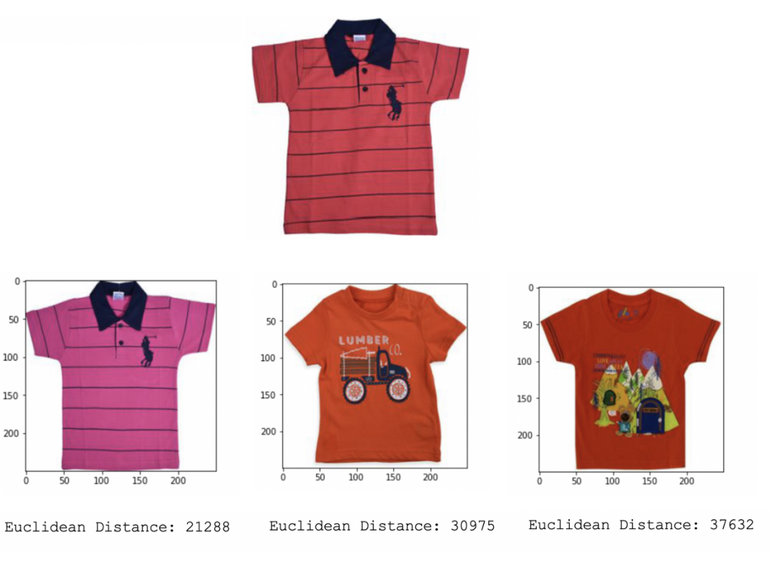 def eucledian_distance(x,y):eucl_dist = np.linalg.norm(x - y)return eucl_dist 定义完所有内容后,我们可以获取任何输入图像的三个最相似的乘积。例如,如果输入以下Polo衫,则会得到以下3个最相似的对象:
