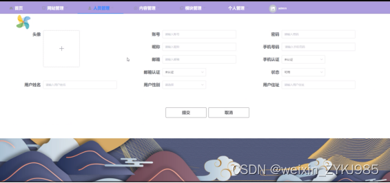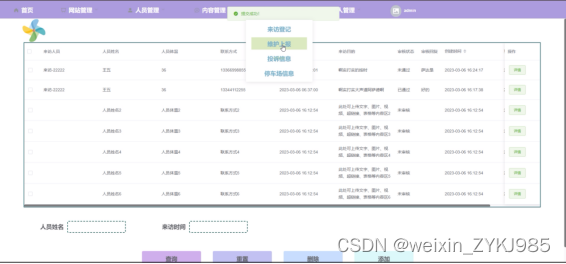 (1)功能要求:完成后台首页、个人管理、网站管理(轮播图、公告信息)人员管理(普通用户、来访人员、管理员)内容管理(社区资讯、资讯分类)模块管理(来访登记、维护上报、投诉信息、停车场信息)等功能模块。