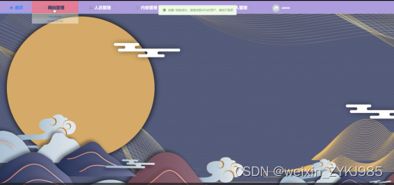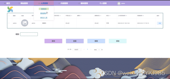 管理员进入系统后台可以查看:后台首页、个人管理、网站管理(轮播图、公告信息)人员管理(普通用户、来访人员、管理员)内容管理(社区资讯、资讯分类)模块管理(来访登记、维护上报、投诉信息、停车场信息)等功能模块。还可进行相应的操作,如图5-2所示。