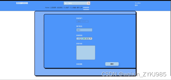 用户点击导航栏上面的投诉信息后,就可以编辑投诉内容、投诉时间等信息进行提交投诉信息,投诉信息界面如下图5-11所示。