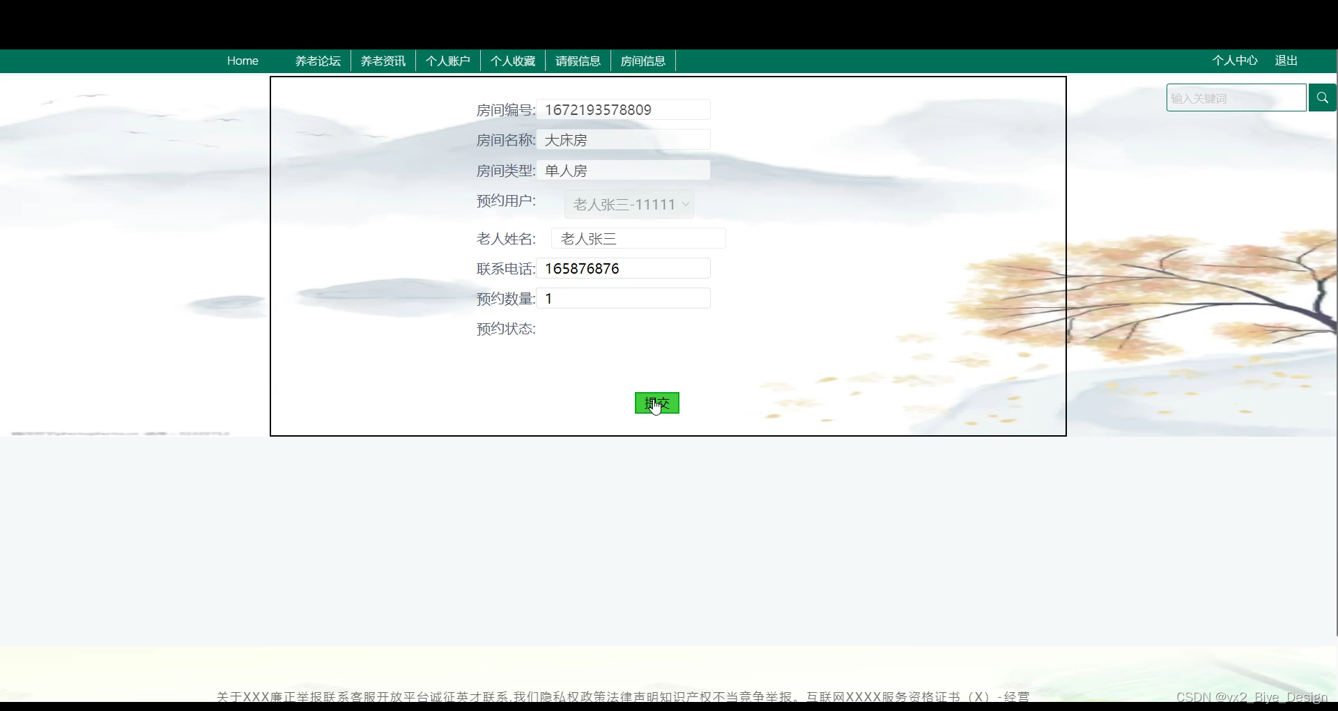 本设计主要实现集人性化、高效率、便捷等优点于一身的养老院管理系统,实现功能包括:网站管理,人员管理,内容管理,模块管理(特别护理,请假信息,退住信息,预约信息,类型管理,房间信息,收费信息,护工信息,护工请假,护工薪资,缴费报表,人员流动)等功能模块。系统通过浏览器与服务器进行通信,实现数据的交互与变更。只需通过一台电脑,动动手指就可以操作系统,实现数据通信管理。整个系统的设计过程都充分考虑了数据的安全、稳定及可靠等问题,而且操作过程简单。本系统通过科学的管理方式、便捷的服务提高了工作效率,减少了数据存储上的错误和遗漏。