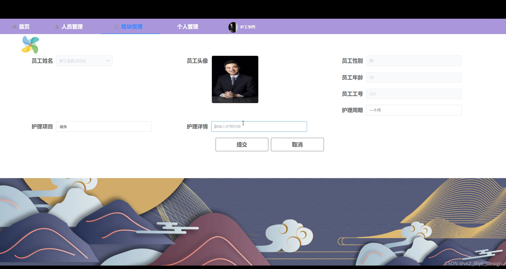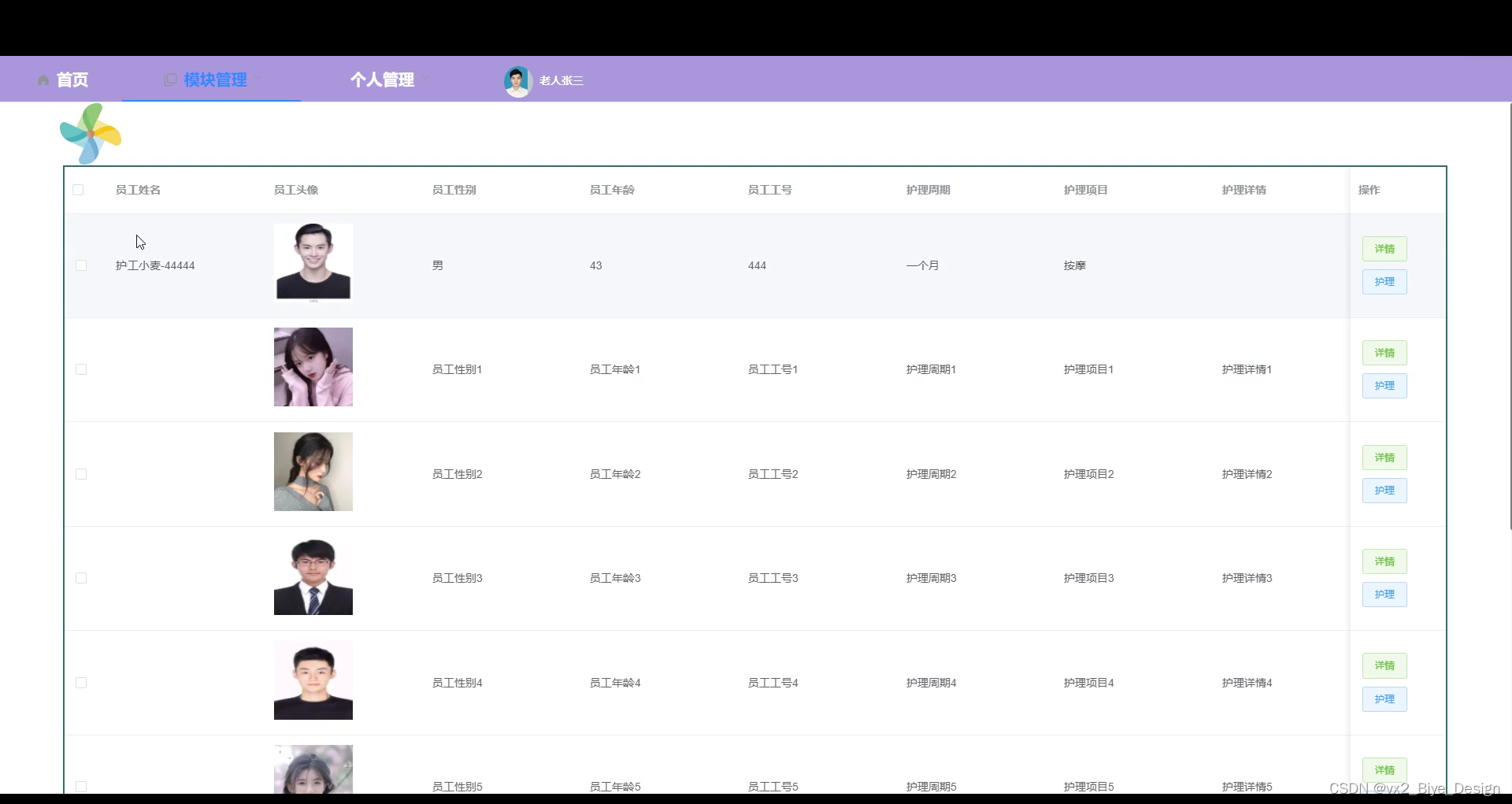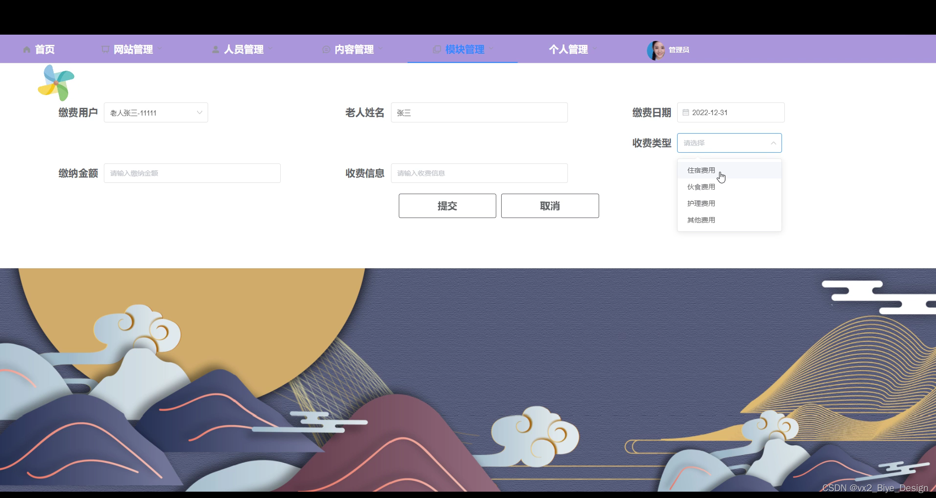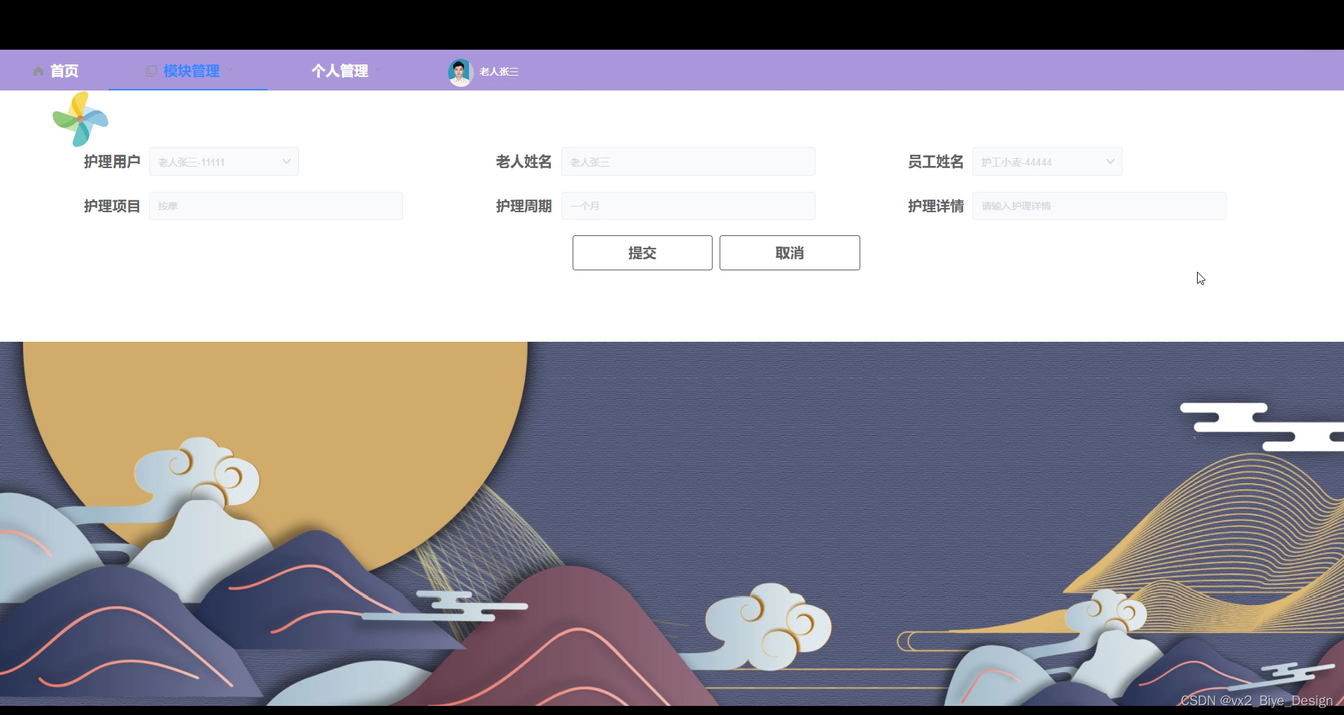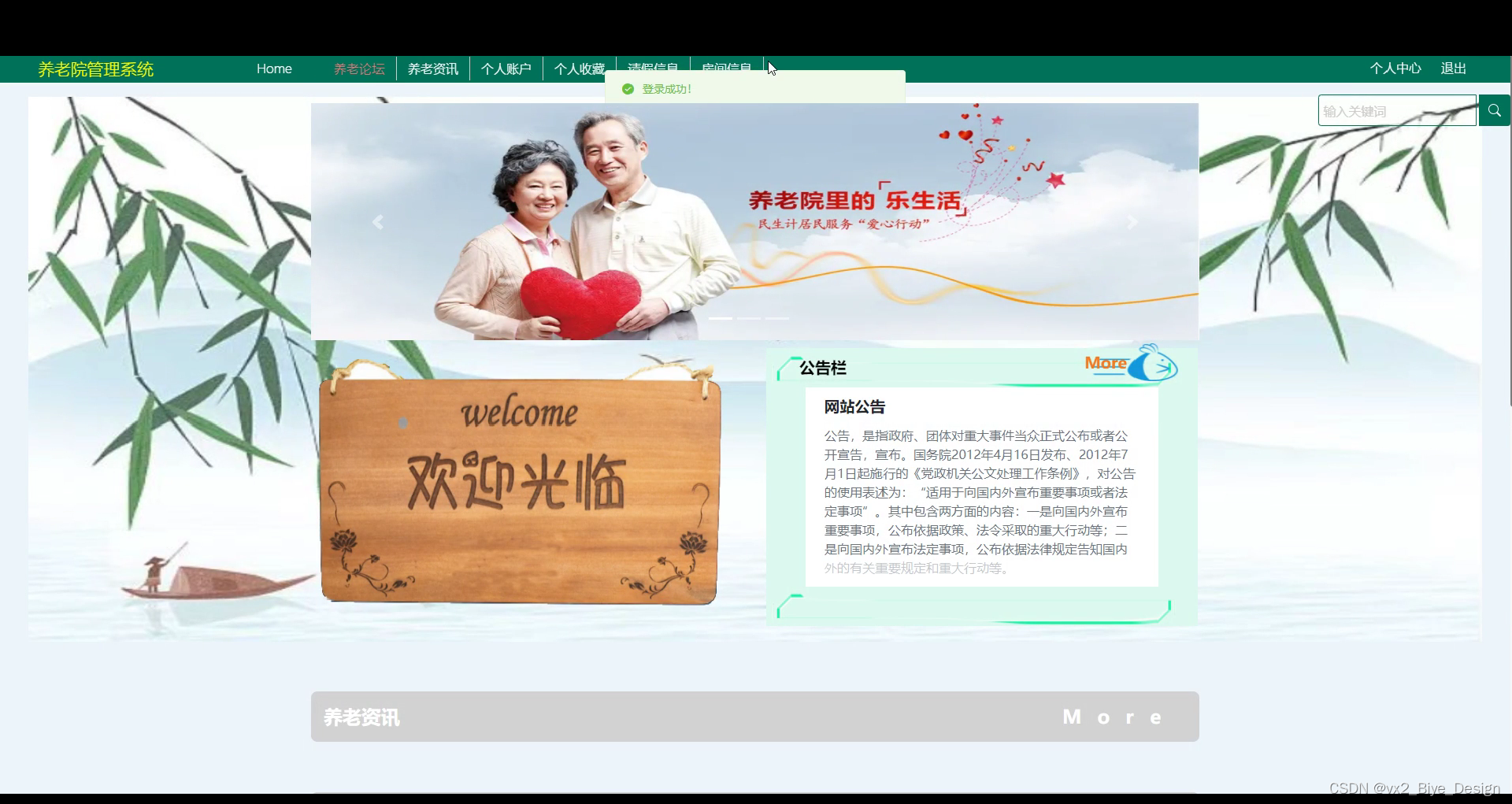 This design mainly implements a nursing home management system that combines the advantages of humanization, efficiency, and convenience. The implementation functions include: website management, personnel management, content management, module management (special care, leave information, check-out information, appointment information, type management, room information, charging information, caregiver information, caregiver leave, caregiver salary, payment report, and personnel flow) and other functional modules. The system communicates with the server through a browser to achieve data interaction and changes. You only need to use a computer and move your fingers to operate the system, achieving data communication management. The entire system design process fully considers issues such as data security, stability, and reliability, and the operation process is simple. This system improves work efficiency and reduces errors and omissions in data storage through scientific management and convenient services.