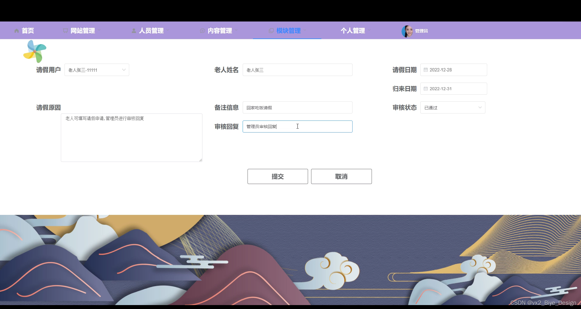 请假信息页面可通过输入请假用户,老人姓名,请假日期,归来日期,请假原因等内容提交请假单。如下图所示。