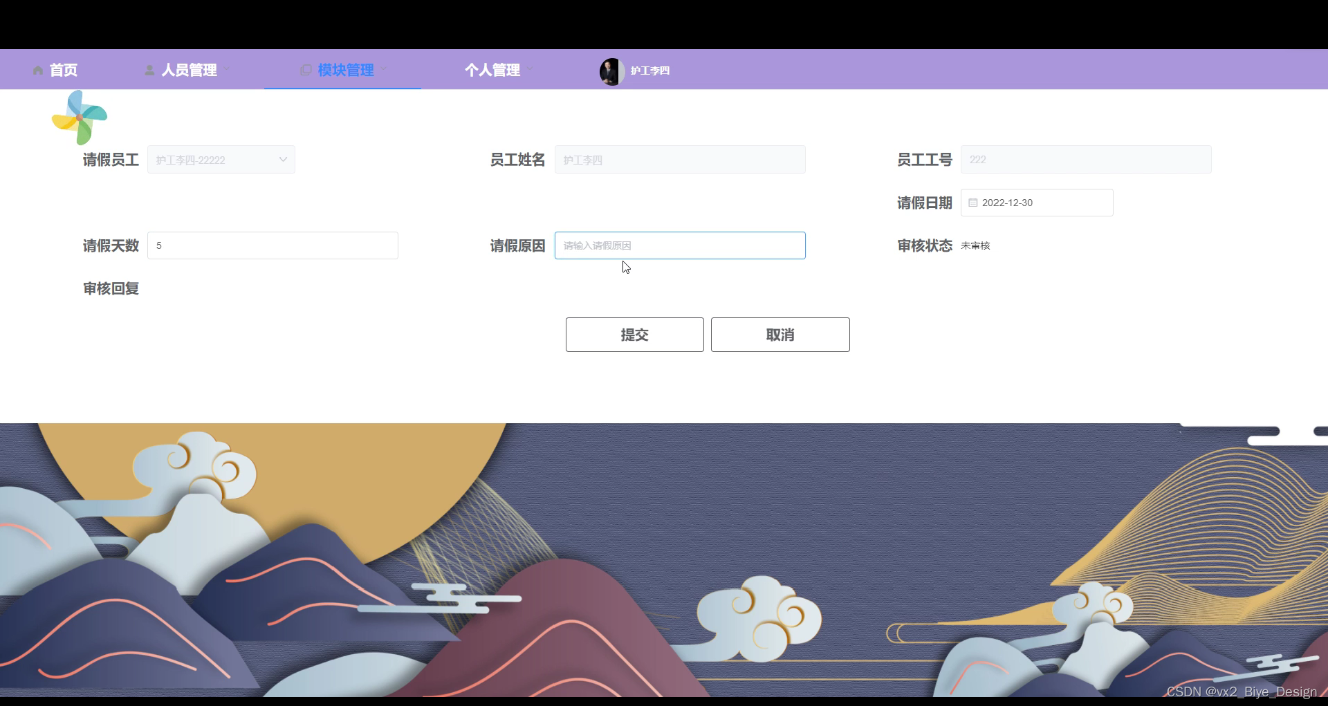 护工用户可以通过输入请假天数,原因,以及个人信息等内容提交请假申请,如下图所示。