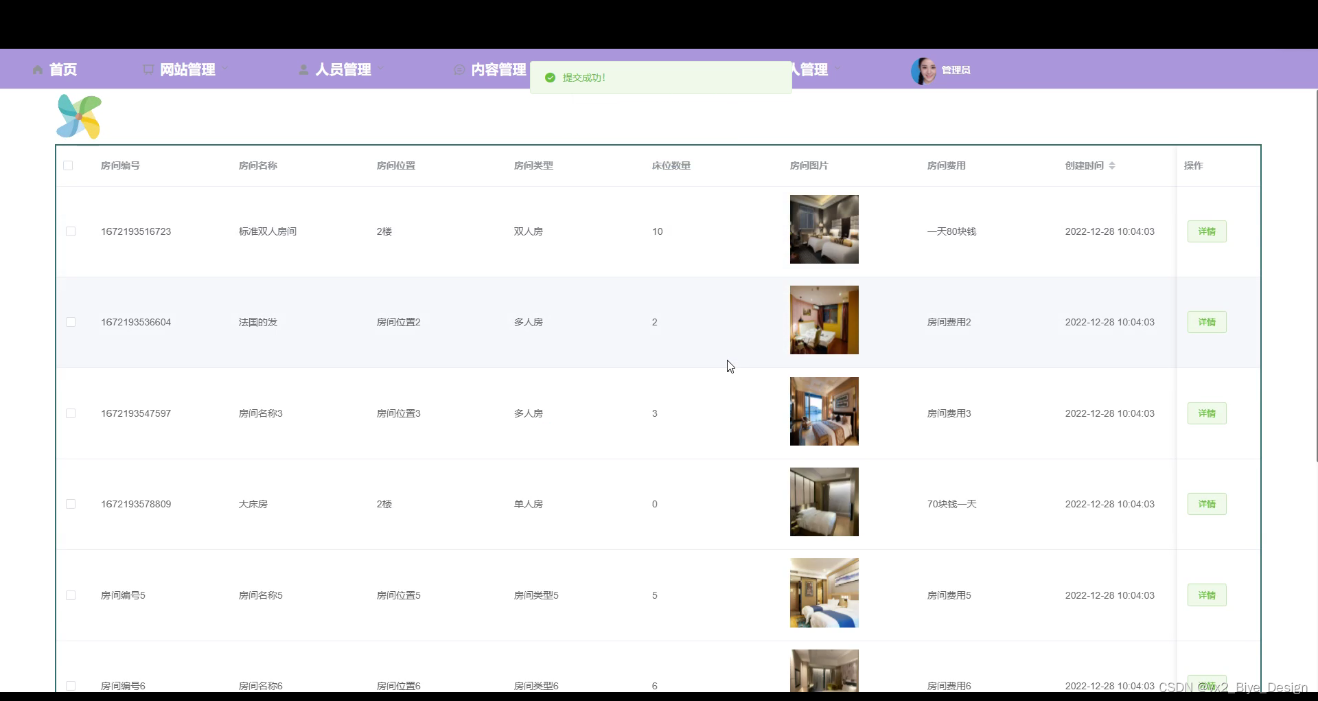 管理员在此页面可查看对房间信息进行维护管理,可以进行查询,重置,添加,删除等操作,如下图所示。