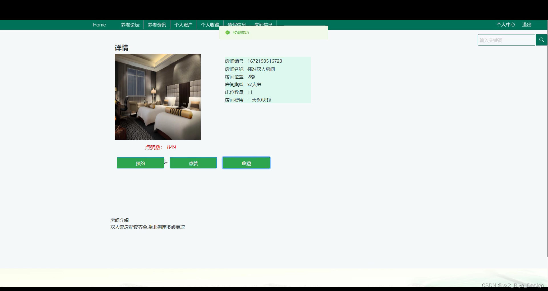 房间信息页面可查看房间名称,类型,位置,费用等信息,可进行预约,点赞,收藏,评论等操作。