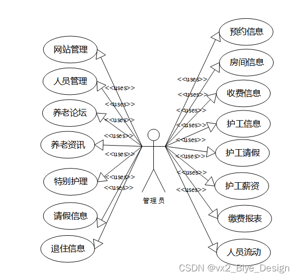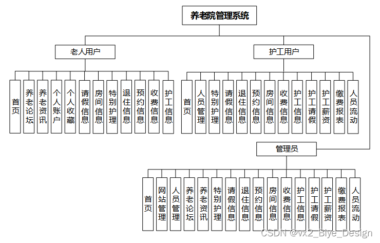 系统设计的目的是分析系统包括的所有功能结构,为开发人员设计开发和实现系统做好准备工作。经过前期的需求调查、分析和整理之后,确定的总体需求主要包括多个模块,分别是:首页,网站管理,人员管理(管理员,护工用户,老人用户),内容管理(养老论坛,论坛分类列表,养老资讯,资讯分类列表),模块管理(特别护理,请假信息,退住信息,预约信息,类型管理,房间信息,收费信息,护工信息,护工请假,护工薪资,缴费报表,人员流动)。系统整体角色分为三个部分,一是老人用户、二是护工用户、最后是管理员。系统功能结构图如下图所示。