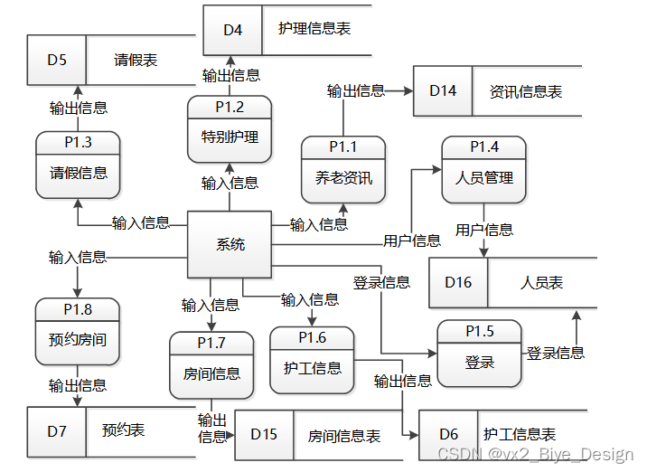 二层数据流程是对一层数据流层图中填写登录注册信息、用户功能的细化。即:填写登录注册信息细化为填制信息、后台审核,用户功能细化为人员管理,养老论坛,养老资讯,特别护理,请假信息,退住信息,预约信息,类型管理,房间信息,收费信息,护工信息,护工请假,护工薪资,缴费报表,人员流动等操作。