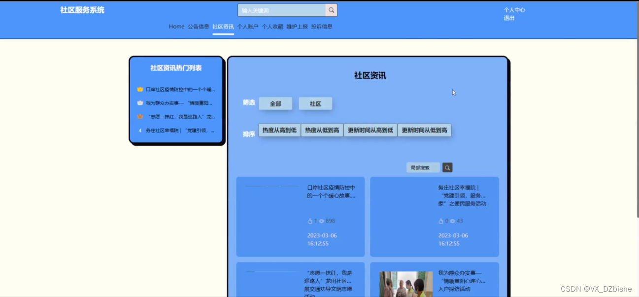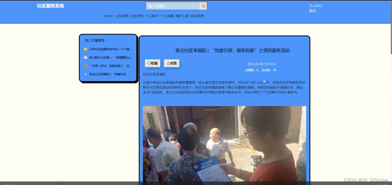社区资讯,用户可以筛选、查看管理员发布的所有社区资讯信息,并可进行收藏、点赞、发表评论等操作,社区资讯如图5-8 5-9所示。