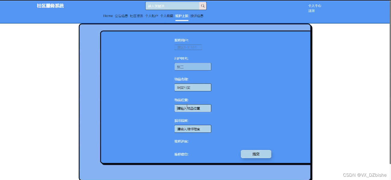 用户在点击导航栏上面的维护上报后,就可以编辑报修用户、用户姓名、物品名称、物品位置、损坏程度等信息进行提交上报维修,维护上报界面如下图5-11所示。