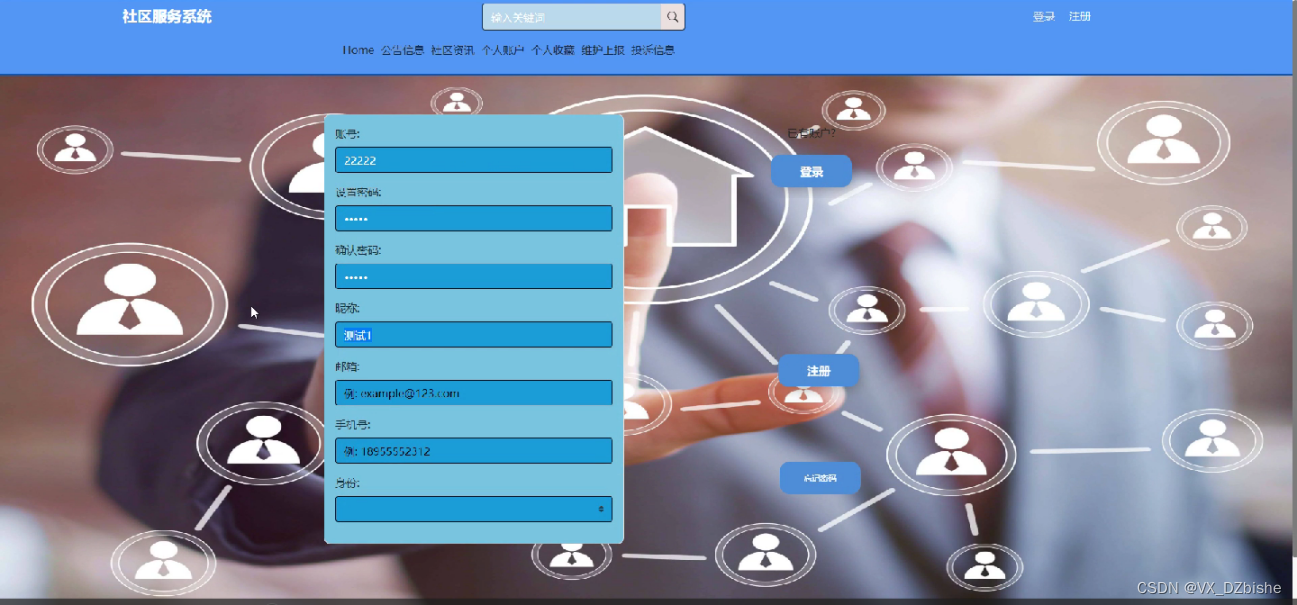 首先来访人员需要注册登录才能进入社区服务系统,通过输入账号,密码进行登录。如图5-13 5-14所示。