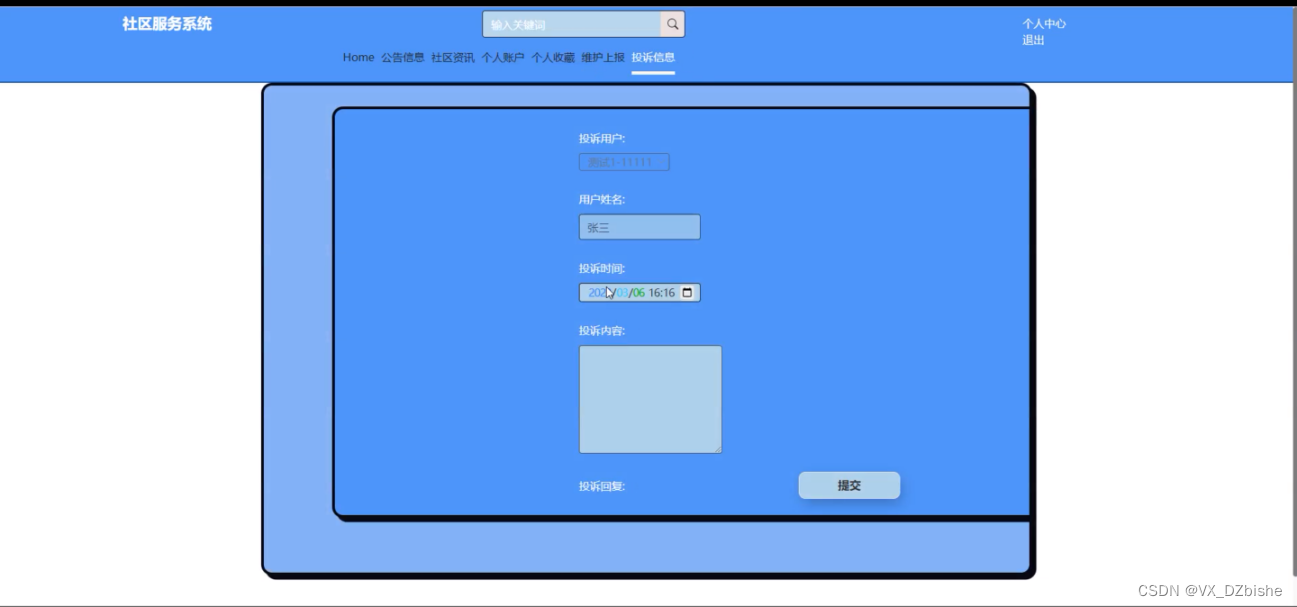 用户点击导航栏上面的投诉信息后,就可以编辑投诉内容、投诉时间等信息进行提交投诉信息,投诉信息界面如下图5-11所示。